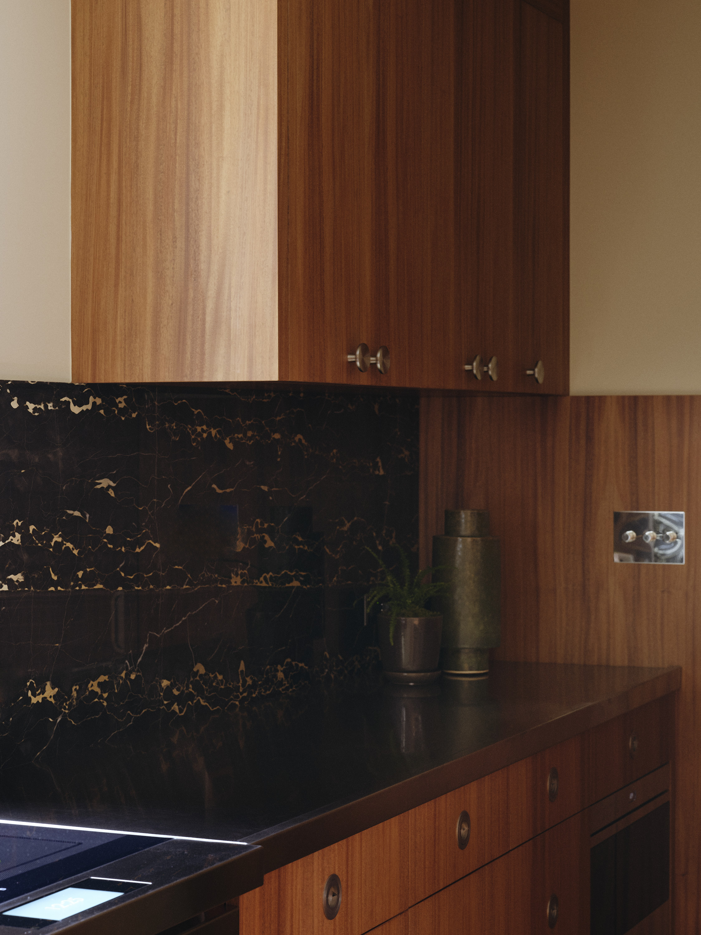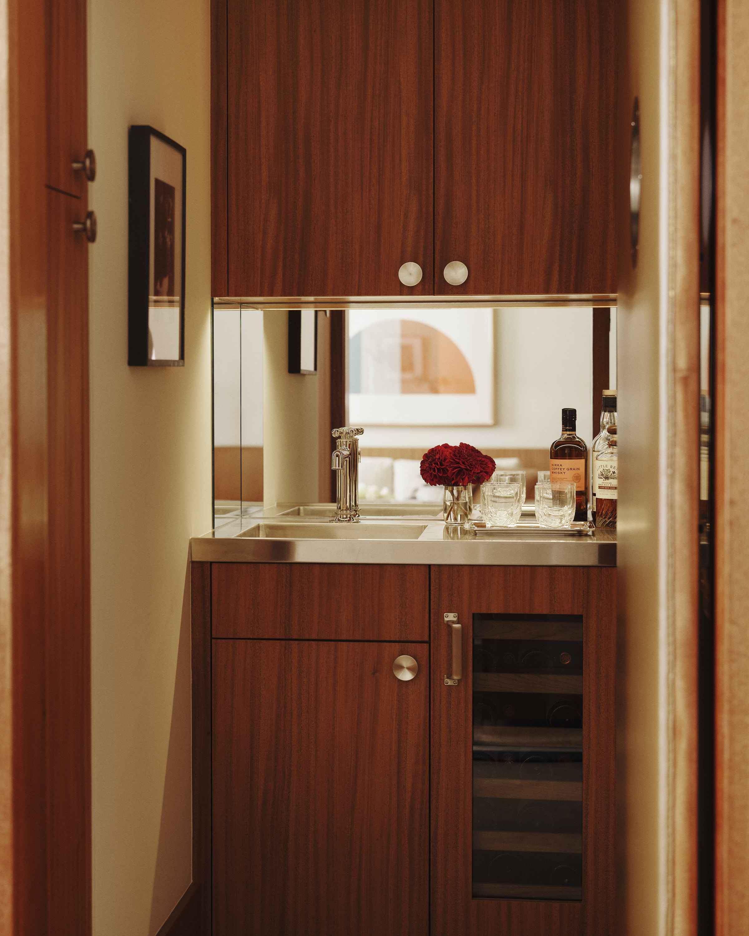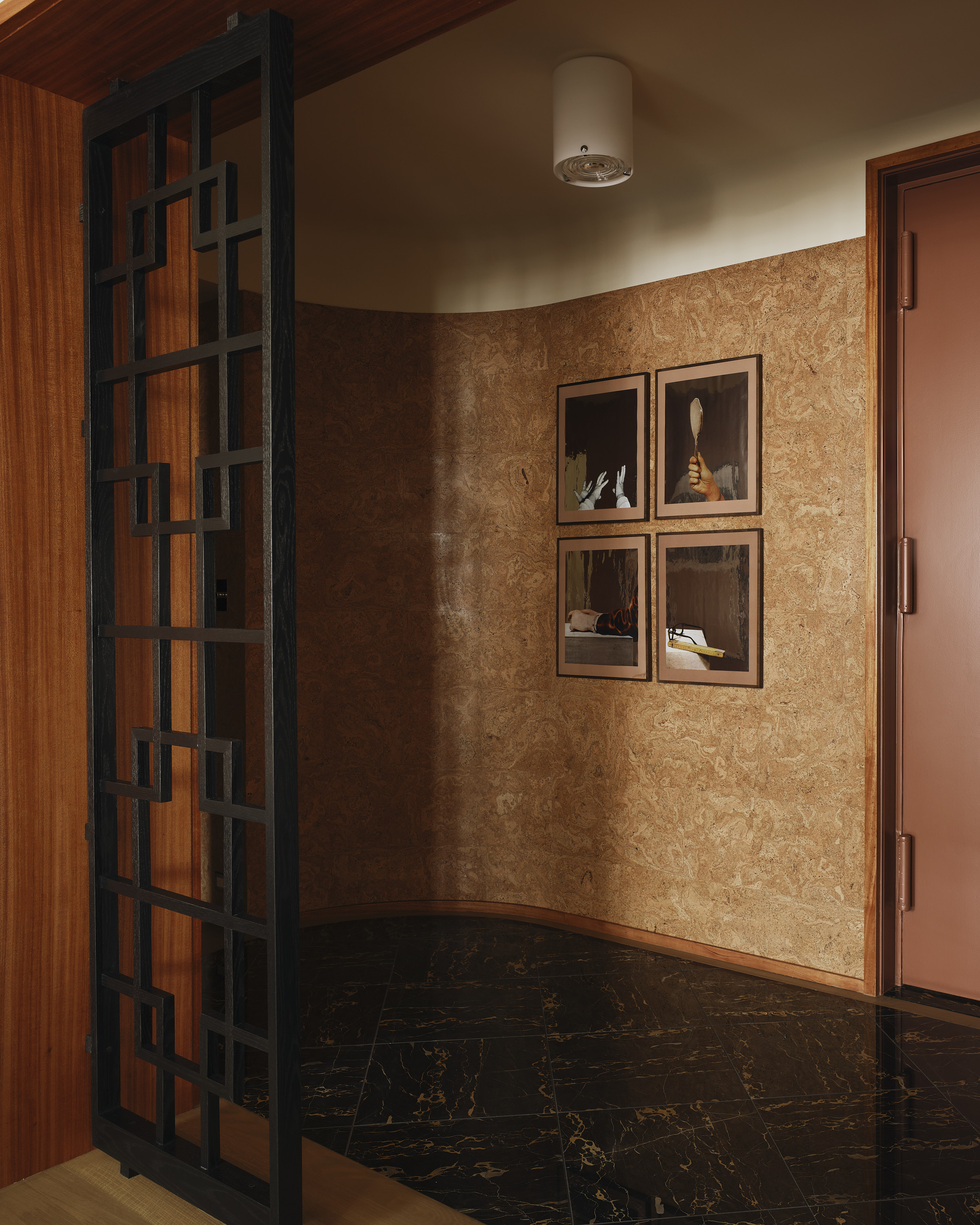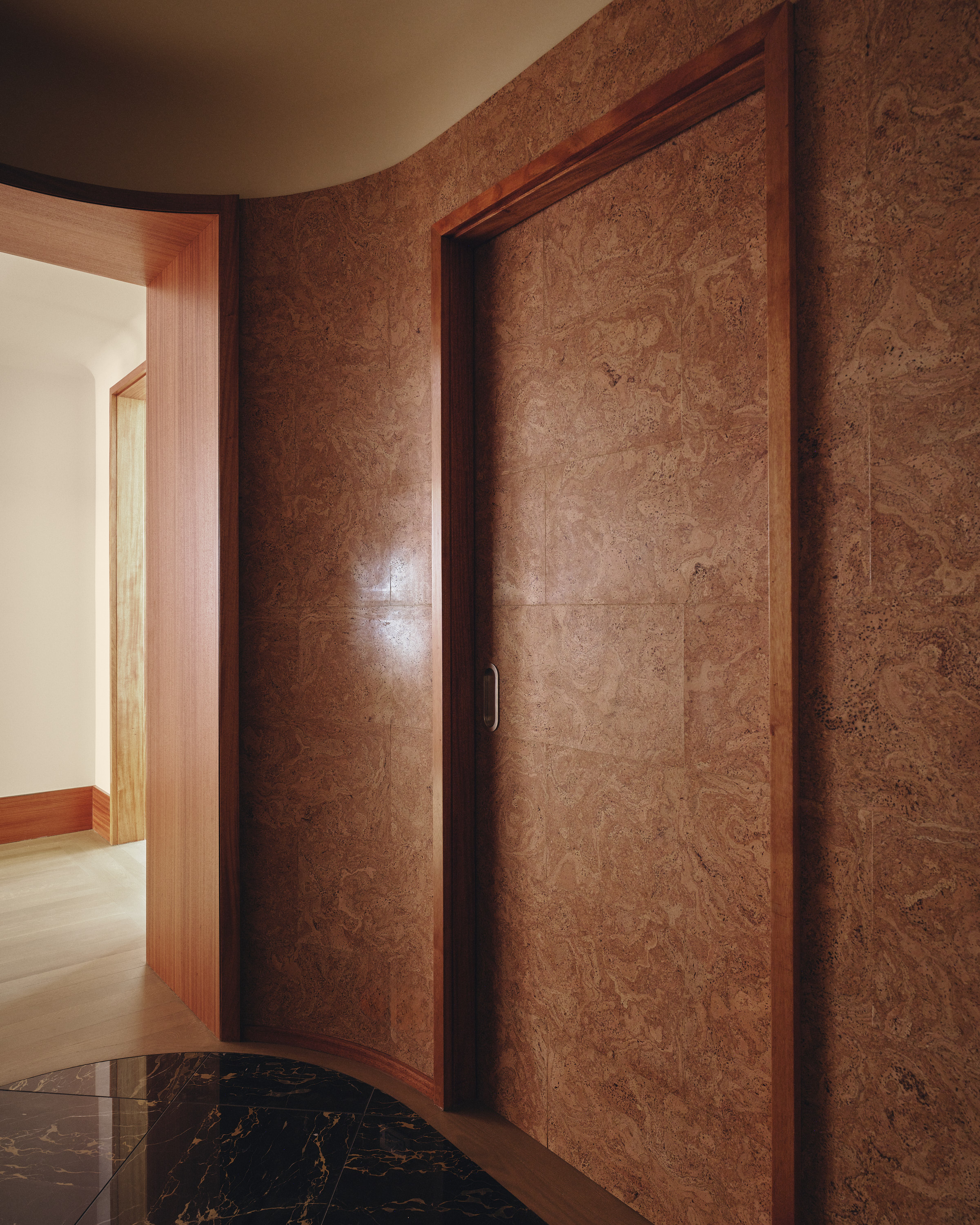 The design approach intentionally introduces warm, organic materials, specifically wood and cork, that were absent from the building’s original minimalist interiors. Expressed with bold intensity, these elements establish a foundation of tactile, sensuous comfort. At the entry, this transition is immediate: cozy cork meets Nelson Rockefeller-approved marble, creating a sophisticated softening of the threshold.